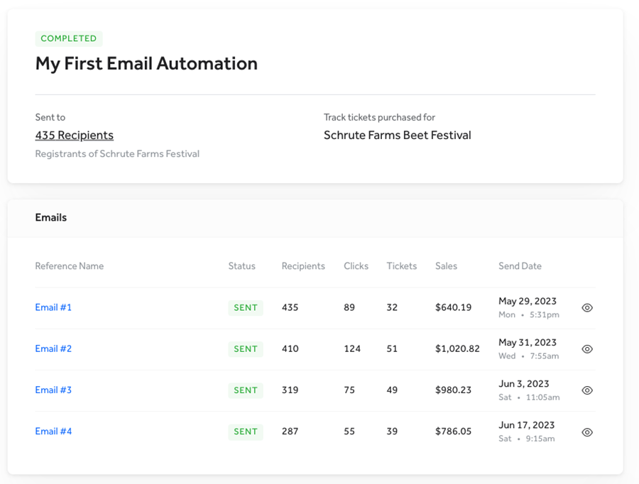 Not only does TicketSpice offer all the email marketing functionality to create and schedule drip campaigns, we can report back the actual sales revenue and tickets sold from each email.