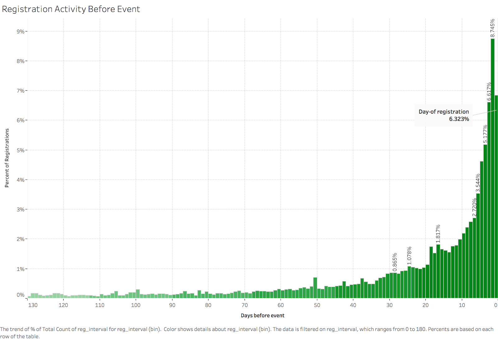 Our goal is that this data would help your decrease your stress level as you work tirelessly to promote your event. Simply because the facts show regardless of how great your promotion is, a majority of people are going to procrastinate to the last minute to make their purchase. This information should help you better project expectations for upcoming years and to be reassured that as scary as it might be to have that number of sales happen to close to event day, the good news is, people are still buying, just procrastinating to do so.